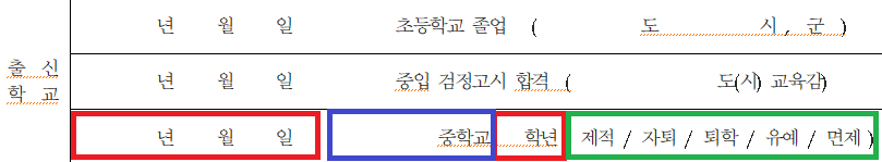 위 사진의 빨간색 및 파란색 네모박스를 잘 확인해 보시면 학교를 졸업하지 못한 사유들(제적, 자퇴, 퇴학, 유예, 면제) 중 한 가지가 기재되어 있습니다. 해당 내용을 찾아서 입학 원서에 동그라미 표시 해주시면 됩니다.