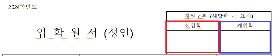 입학 원서에 작성할 내용은 크게 지원 구분, 지원자에 대한 개인 정보(주소, 성명, 연락처)와 최종 학력 및 출신학교입니다. 학교마다 양식은 조금씩 다르지만 작성하는 문구는 비슷하기 때문에 아래 설명을 보시고 지원하실 학교의 서류에 맞게 작성하시면 됩니다.